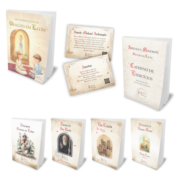 Além disso, você receberá mais 2 Materiais de Apoio, o Caderno de Exercícios, com mais de 1.000 atividades práticas para memorizar o Latim com facilidade, e os Cartões de Orações, perfeitos para imprimir ou usar no celular e ter sempre consigo as principais Orações em Latim.